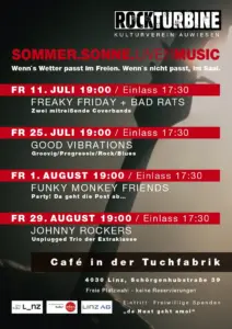 Auf der Bühne: Coverbands vom Allerfeinsten – mitreißend, leidenschaftlich, 100 % live! Von Rockklassikern über Pop-Hymnen bis zu tanzbaren Partytracks ist alles dabei. Mitsingen, tanzen, feiern – hier bleibt niemand sitzen!